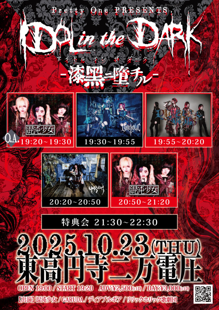2025.10/23(thu) 2025.10/23(thu) Pretty One PRESENTS 「IDOL in the Dark-漆黒ニ堕チル-」 混沌少女 リリックホリック歌劇団 ディアブルボア GARUDA open.19:00 start.19:20 adv.2,500yen door.3,000yen(+1d 600yen) TICKET https://tiget.net/events/421928 店予約受付無し