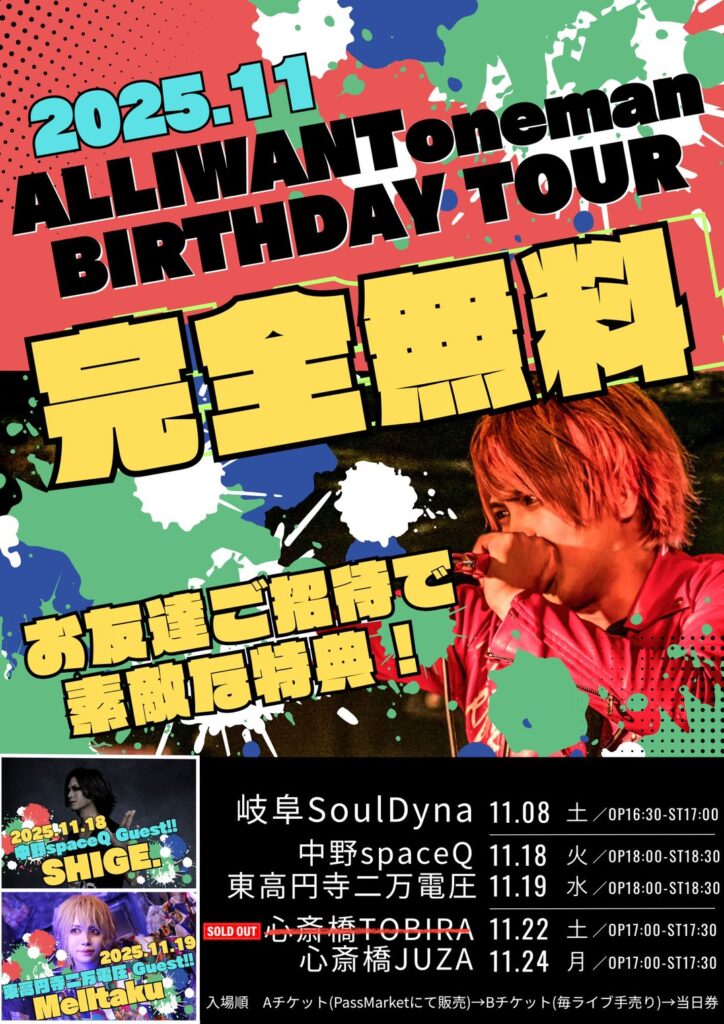 2025.11/19(wed) 2025.11/19(wed) ALL I WANT oneman BIRTHDAY TOUR〜完全無料 東京バンド編 ALL I WANT Guest.Melltaku open.18:00 start.18:30 adv.0yen door.0yen(+1d 600yen) 店予約受付無し