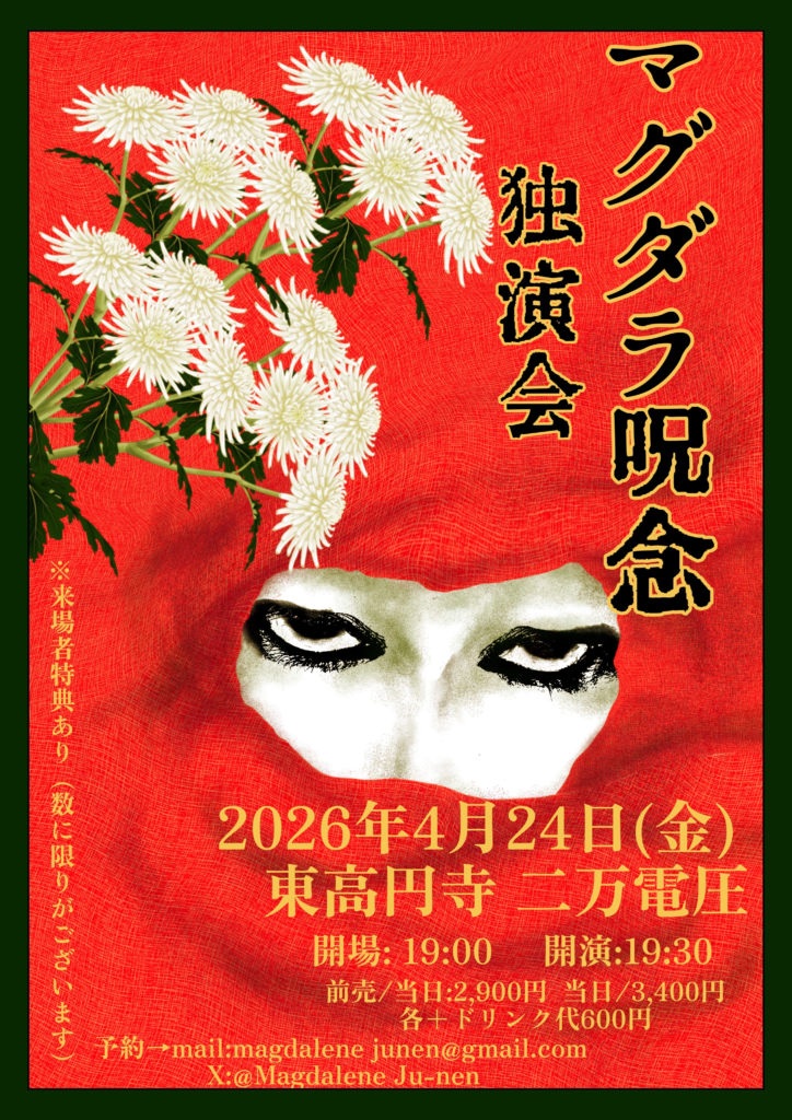 2026.4/24(fri) 2026.4/24(fri) “マグダラ呪念独演会” マグダラ呪念 open.19:00 start.19:30 adv.2,900yen door.3,400yen(+1d 600yen) ※来場者特典あり(数に限りがございます) ご予約