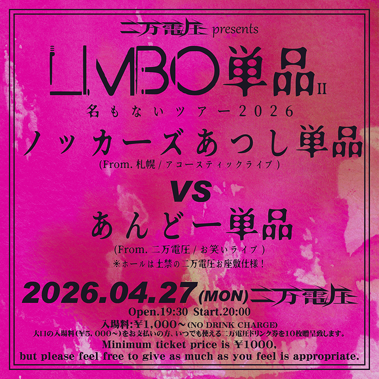 2026.4/27(mon) 2026.4/27(mon) 二万電圧 presents “LIMBO単品Ⅱ -名もないツアー2026-“ ノッカーズあつし単品(札幌) あんどー単品 open.19:30 start.20:00 入場料 ¥1,000- Minimum ticket price is ¥1000, but please feel free to give as much as you feel is appropriate. 店予約受付無し