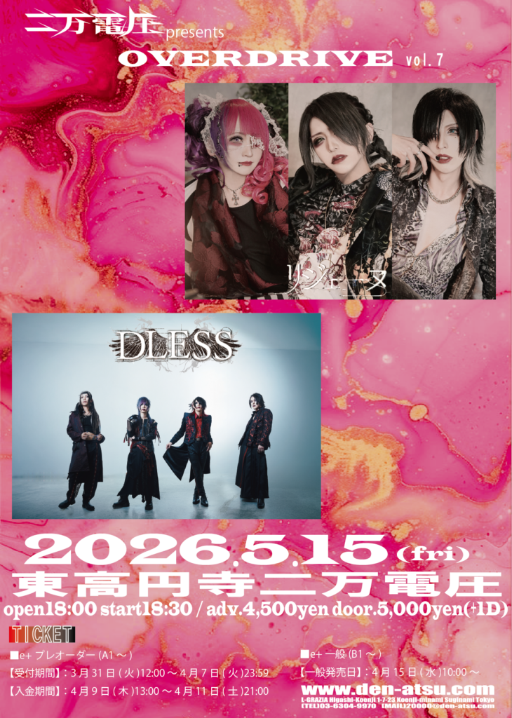 2026.5/15(fri) 2026.5/15(fri) 二万電圧 presents 「OVERDRIVE」vol.7 DLESS リジェーヌ open.18:00 start.18:30 adv.4,500yen door.5,000yen(+1d 600yen) e+ 店予約受付無し