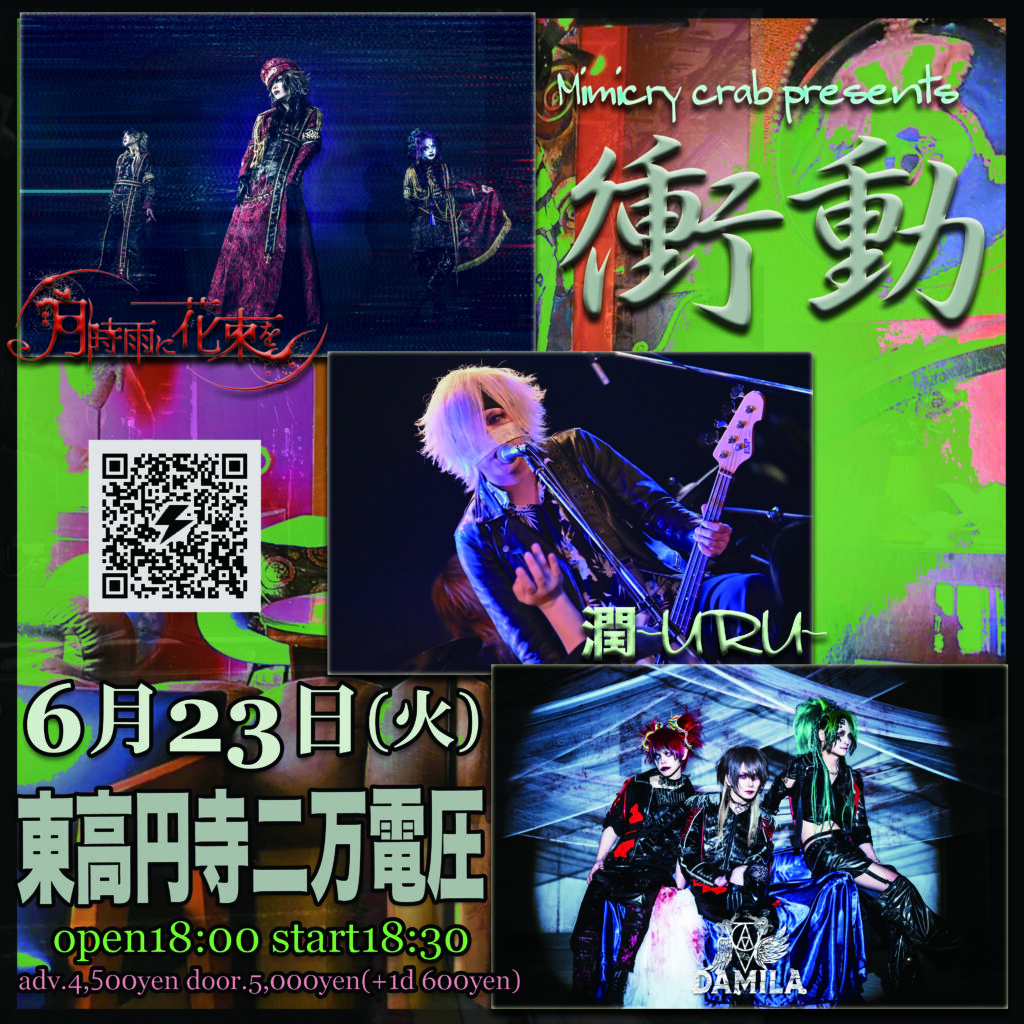 2026.6/23(tue) 2026.6/23(tue) Mimicry crab presents“衝動” 月時雨に花束を DAMILA 潤-URU- open.18:00 start.18:30 adv.4,500yen door.5,000yen(+1d 600yen) e+ 店予約受付無し